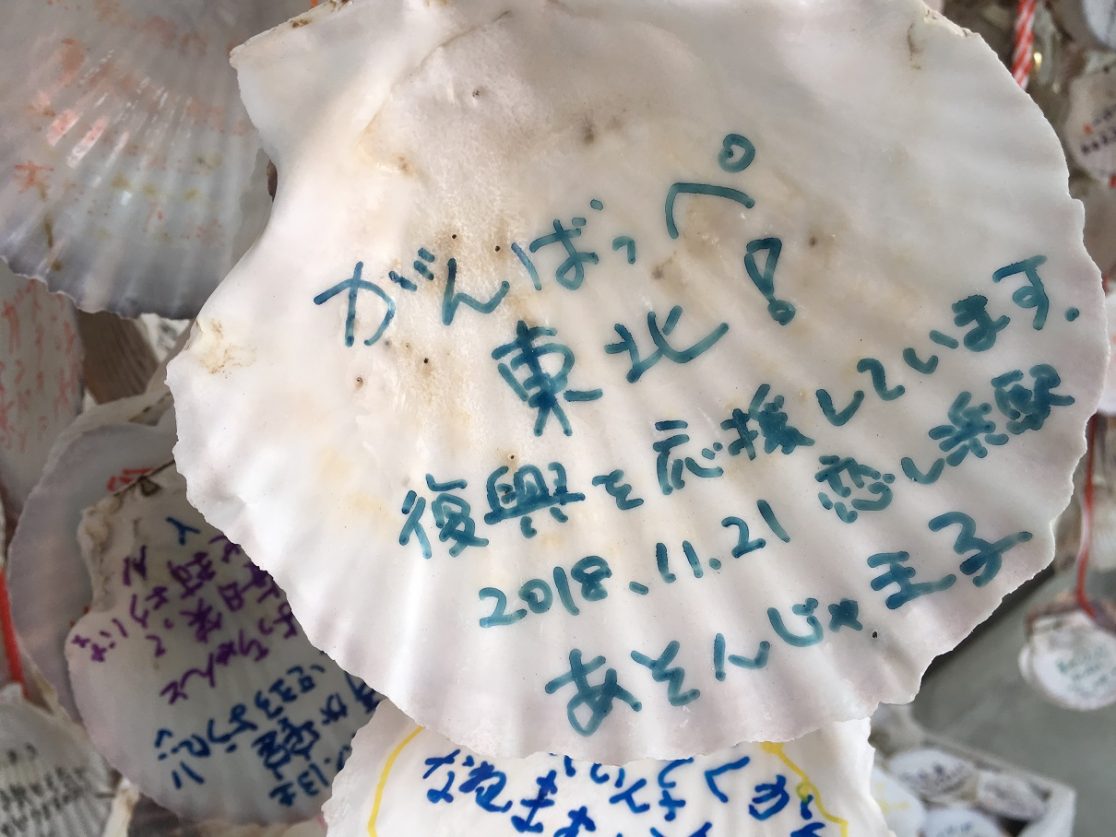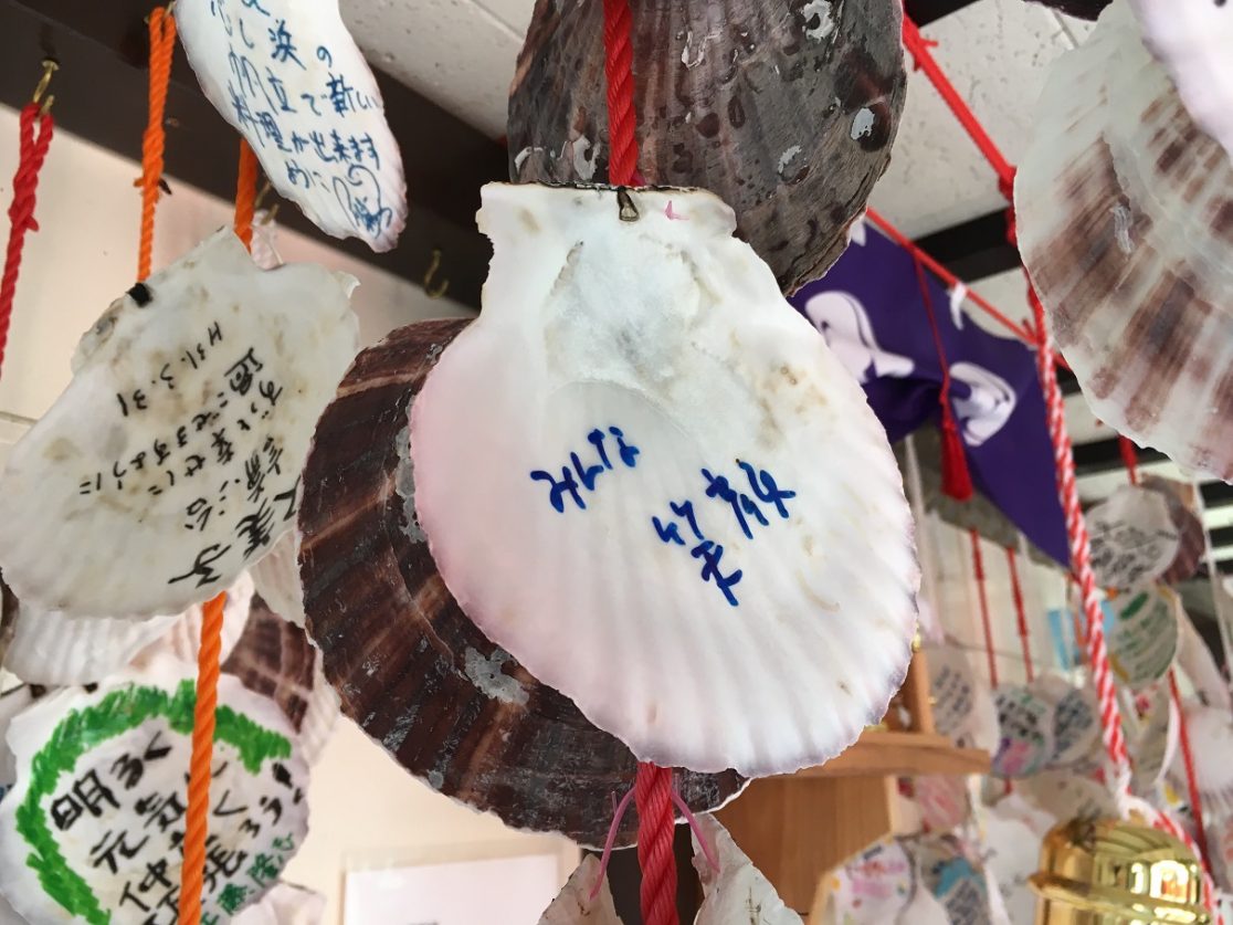 「恋し浜駅」には、吊るされたホタテの貝殻に思い思いの復興メッセージが書かれている。