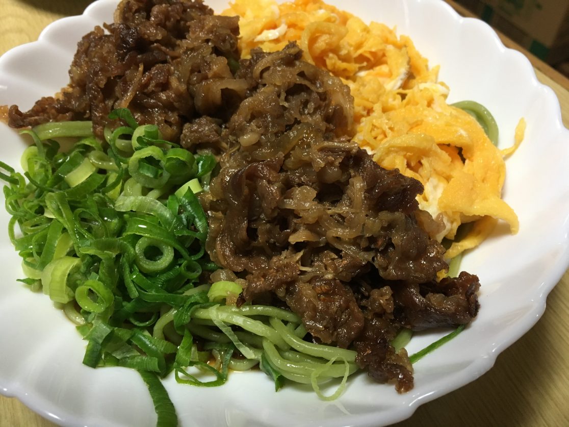 夜はお母さんお手製の地元名物瓦そば(肉とネギ、卵の乗った温かい茶そば)